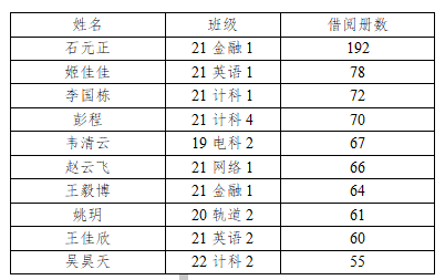 图书馆根据读者在2022年11月初至2023年10月底期间个人册数评选出前10名的学生读者为“阅读之星”均予以表彰并颁发证书。