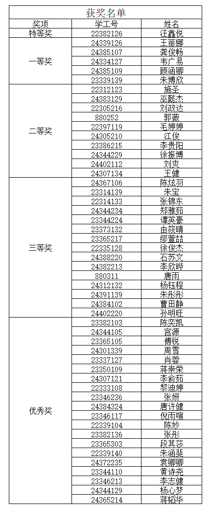 本次比赛按照答题成绩及答题用时评选出特等奖1名、一等奖5名、二等奖10名、三等奖15名及优秀奖20名,现将获奖名单公布如下: