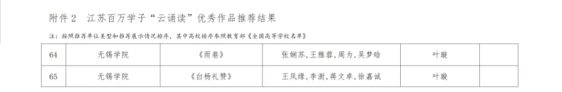 在江苏百万学子“云诵读”活动中,我校物联网工程学院张娴苏、王雅蓉、周为、吴梦晗同学的诵读作品《雨巷》与自动化学院王凤缘、李澍、蒋文卓、徐嘉诚同学的诵读作品《白杨礼赞》以真挚的情感表达与精良的呈现效果获评优秀作品。