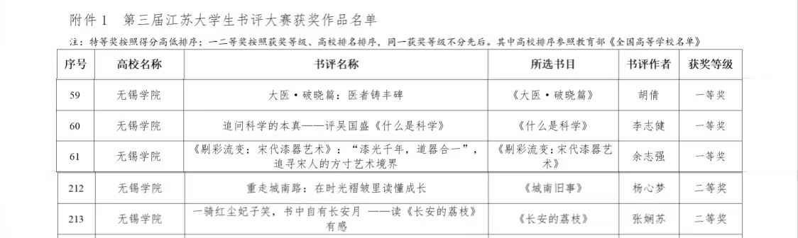 在江苏大学生书评大赛中,我校学子展现出较强的文本解读能力与鲜明的表达风格。传媒与艺术学院胡倩同学的作品《大医·破晓篇:医者铸丰碑》、网络空间安全学院李志健同学的作品《追问科学的本真——评吴国盛〈什么是科学〉》和传媒与艺术学院余志强同学的作品《〈剔猜流变:宋代漆器艺术〉:‘漆光千年,道器合一’,追寻宋人的方寸艺术境界》荣获一等奖,物联网工程学院杨心梦同学的作品《重走城南路:在时光褶皱里读懂成长》、张娴苏同学的作品《一骑红尘妃子笑,书中自有长安月——读〈长安的荔枝〉有感》荣获二等奖,五位获奖同学均被授予“读书标兵”称号。