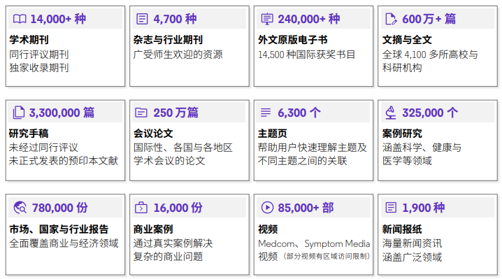 汇集上百个全文期刊子库内容,涵盖商学、经济学、人文、社科、理工、生物、农业、医学、心理学等170多个学科,涉及英语、西班牙语、法语、德语、葡萄牙语等100多种语言。收录了3万多种出版物:1.8万多种学术期刊,1万多种核心期刊(AHCI、 SSCI 、ESCI 、SCIE)1.3万多种全文现刊,4400多种行业杂志。还提供学位论文、报纸、会议、报告、新闻、多媒体等各类全文资源:收录超过35万篇博硕士学位论文、超过24万篇会议论文及记录、320多万份研究手稿、超过410万份报告(包括公司报告、市场报告、行业报告、国家报告等)、218万份公司简介、2.2万部多媒体资源,2500多种全球发行的重要报纸文献。