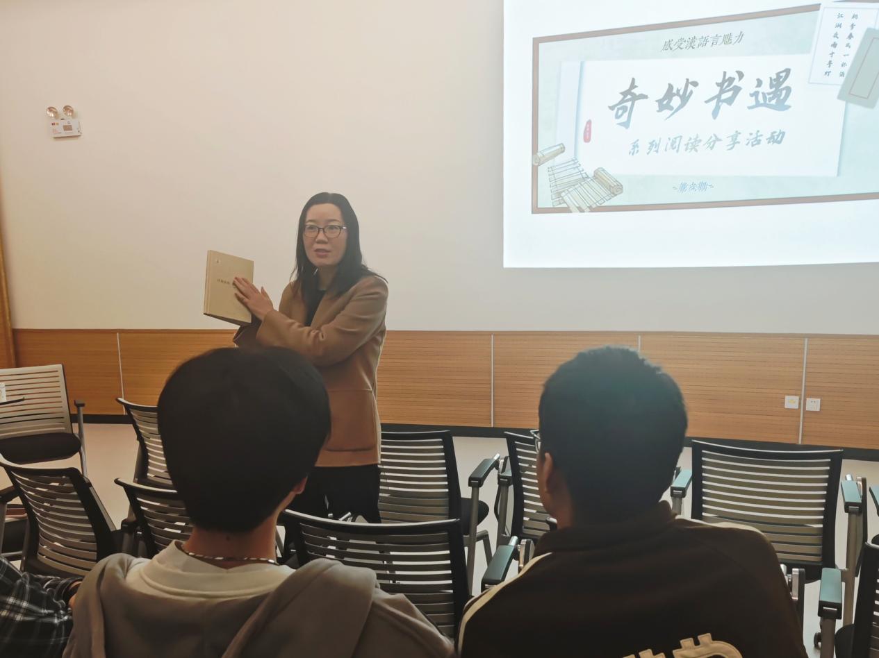 活动现场,同学们依次上台,分享自己的读书感悟。徐仇乐言同学从辛弃疾的诗词出发,剖析南宋词人忧国忧民的时代情怀;李果同学通过解读杜甫的诗句,为现场听众讲述了唐王朝由盛转衰的历史进程。最后,卢老师对分享者们的发言作出点评,并推荐分享了著作《汉语音韵》,她从书中的“反切”一章出发,向同学们讲解了古人学习汉语读音的方法,同时以经典诗词中的音韵为例,生动形象地解释了唐诗宋词中韵脚使用的奇妙之处,帮助同学们形成了更加深刻的音韵认知,使同学们对汉语言产生了浓厚的兴趣。