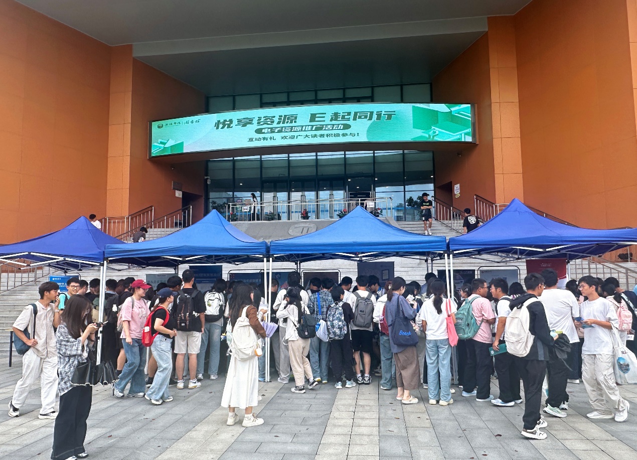 为深化电子资源服务效能,助力师生高效获取学术信息,提升信息素养与资源利用能力,9月24日上午,图书馆联合多家数据库厂商,在图书馆门前广场开展了2025年“悦享资源 E起同行”电子资源推广活动。