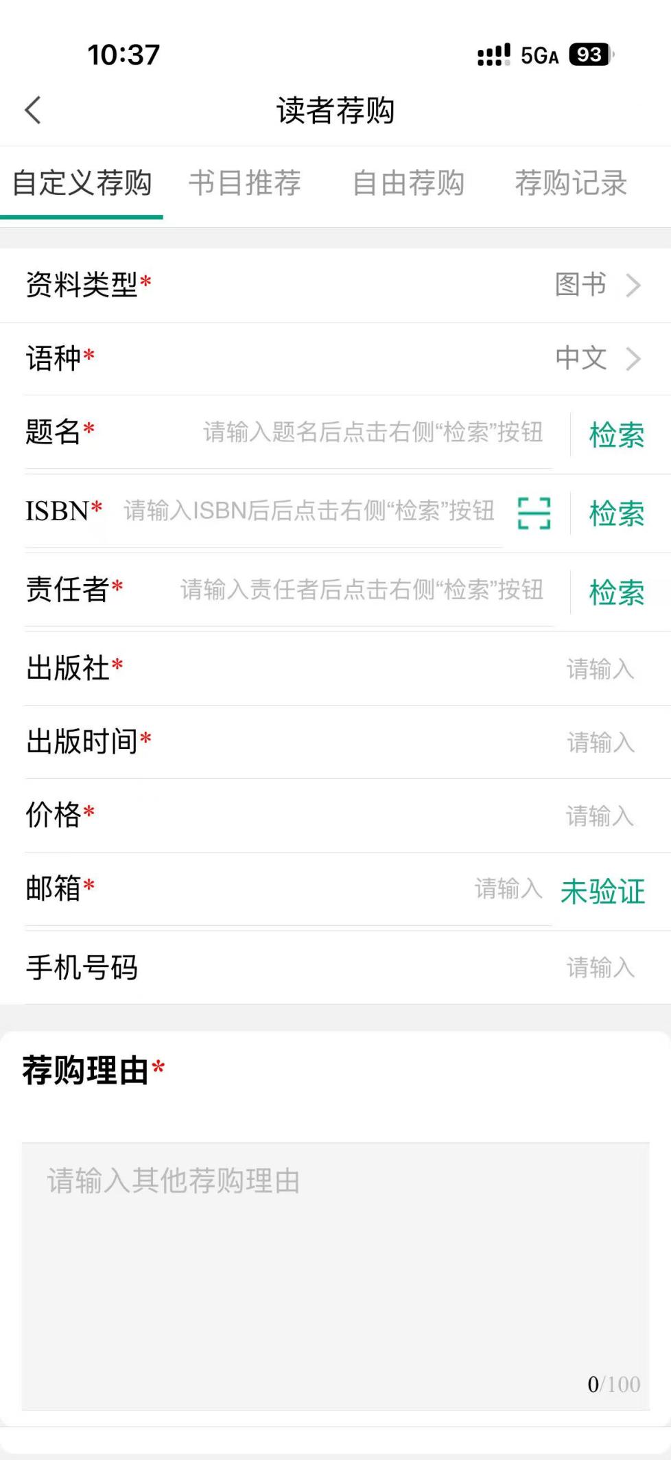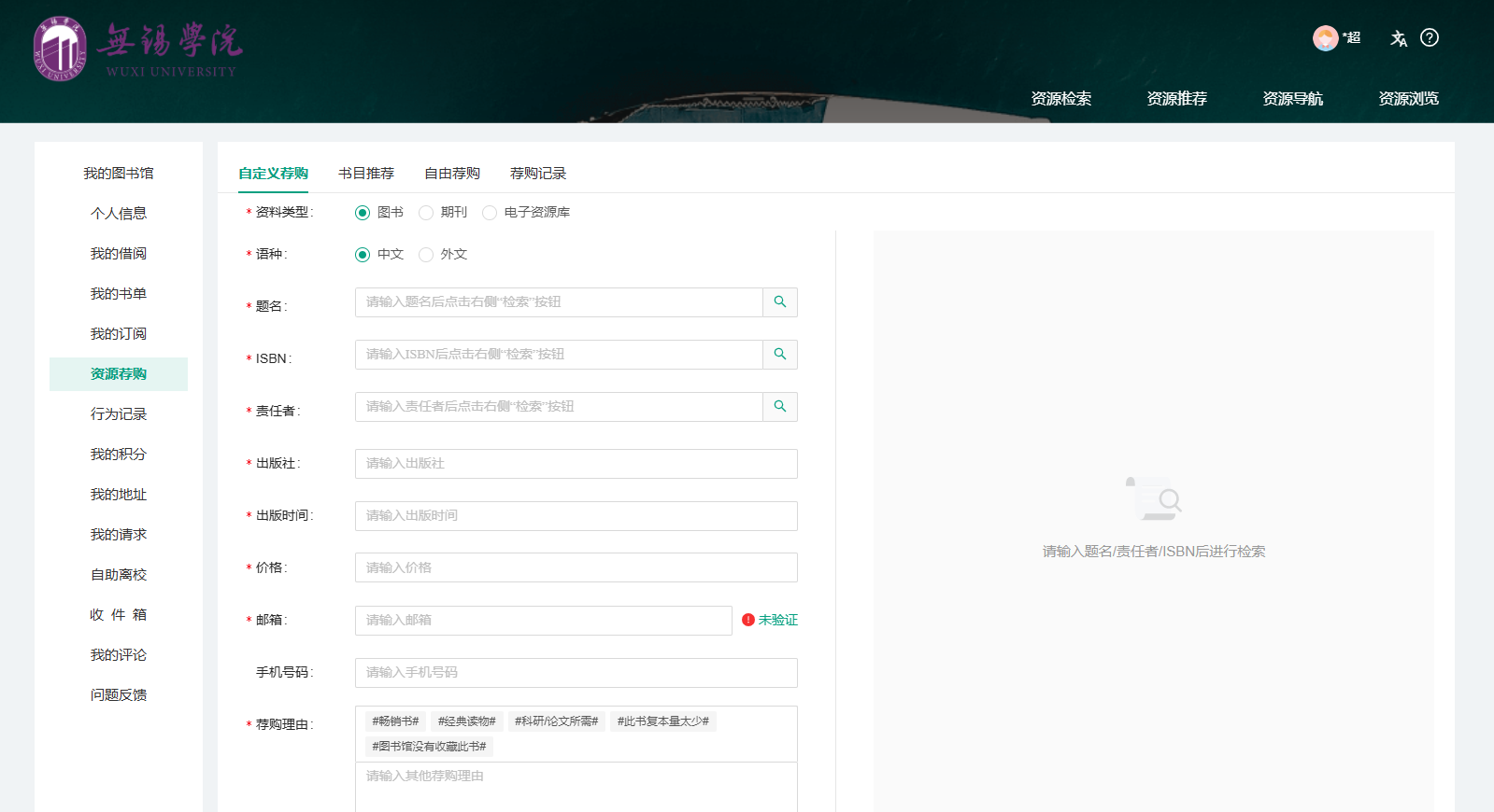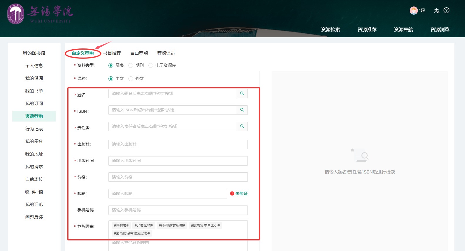 (1)【自定义荐购】:点击“自定义荐购”,读者可直接输入图书的具体信息(即语种、题名及ISBN等)进行荐购。