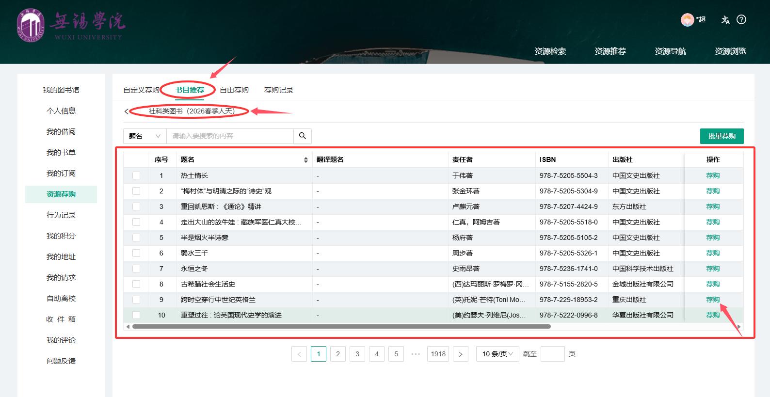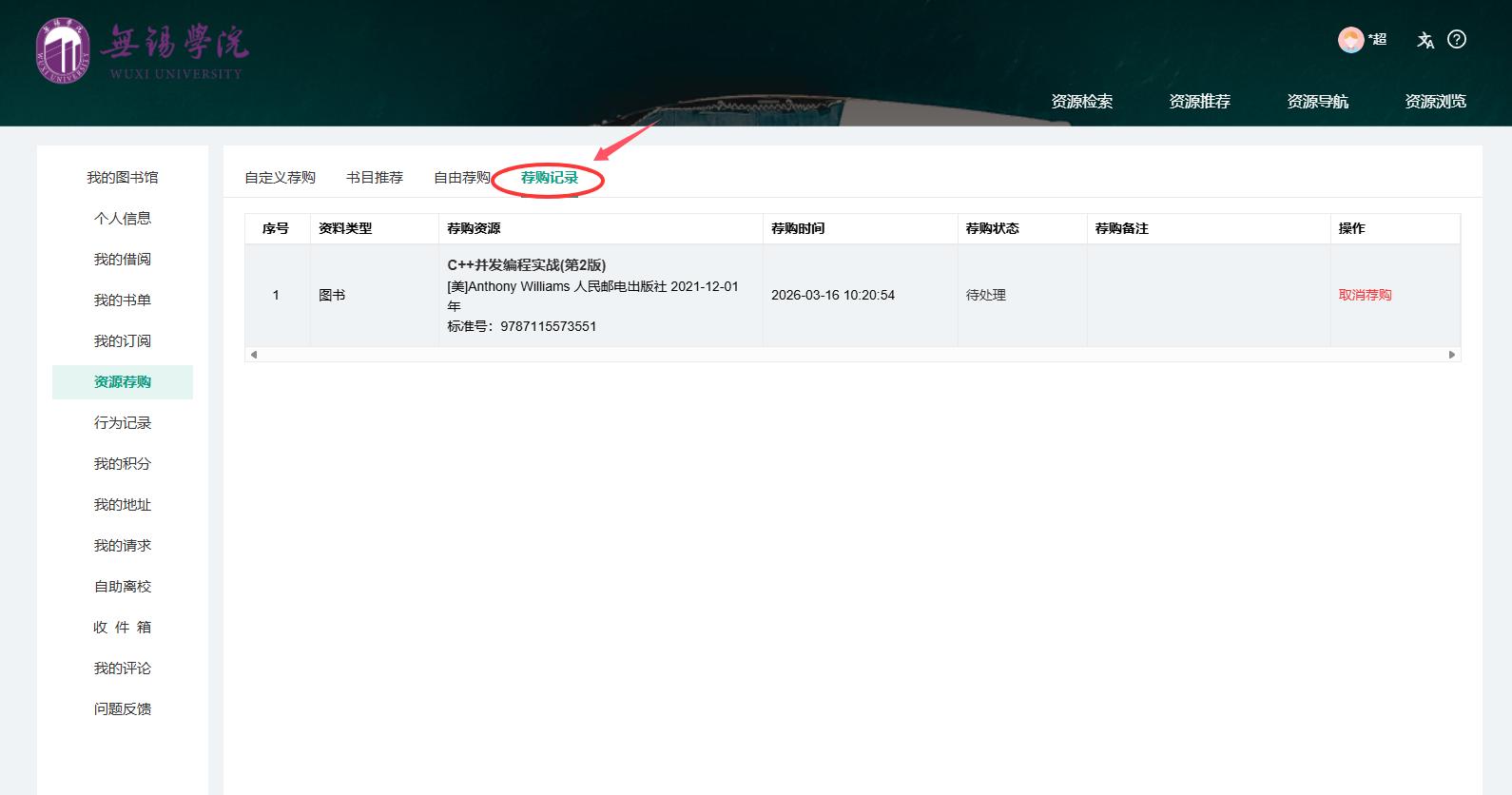 (4)【荐购记录】:可查看个人荐购历史。