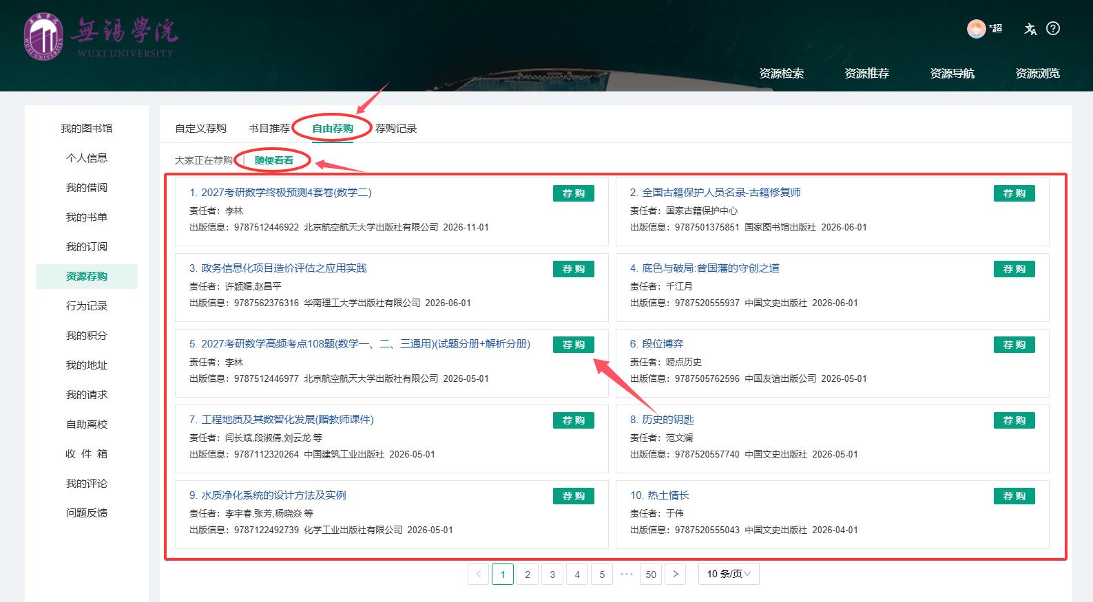 (3)【自由荐购】:在“自由荐购”菜单下,点击“随便看看”,即可浏览中央知识库的书目。点击书目右侧的“荐购”,即可一键完成荐购申请。