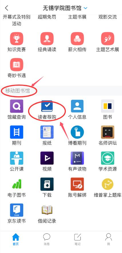 2.下滑找到“移动图书馆”-“读者荐购”;